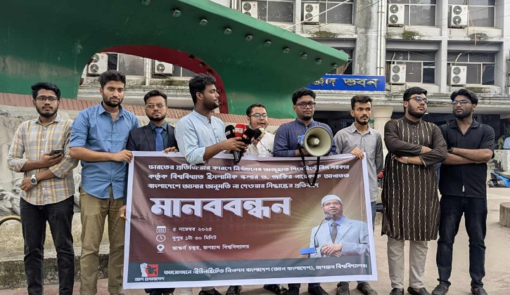 জবি প্রতিনিধি: বিশ্বখ্যাত ইসলামিক স্কলার ড. জাকির নায়েককে বাংলাদেশে আসার অনুমতি না দেয়ার সিদ্ধান্তের প্রতিবাদে মানববন্ধন করেছে ইউনাইটেড পিপলস (আপ) বাংলাদেশের জগন্নাথ বিশ্ববিদ্যালয় শাখা। বুধবার (৫ নভেম্বর) বিশ্ববিদ্যালয়ের ভাস্কর্য চত্বরে এই মানববন্ধন অনুষ্ঠিত হয়।